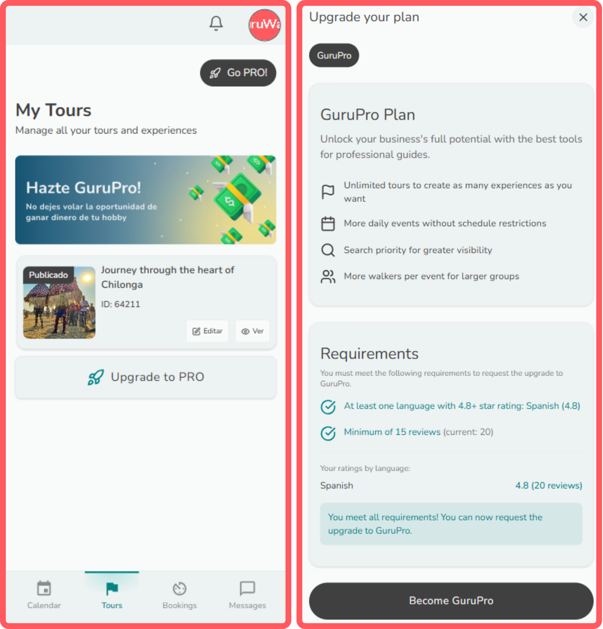 Tour requirements: your tour must have at least 15 reviews and a rating of 4.80 or higher before you can apply for the PRO plan.